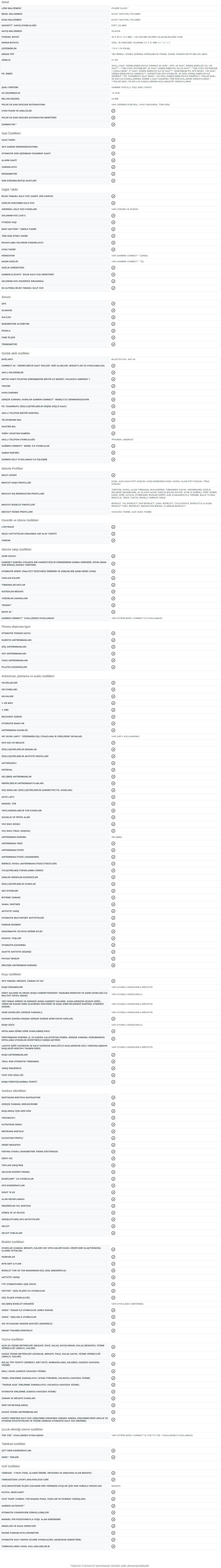 - 5 Bu tıbbi bir cihaz değildir ve herhangi bir tıbbi durumun teşhisinde veya izlenmesinde kullanılması amaçlanmamıştır; bkz. Garmin.com/ataccuracy. Pulse Ox tüm ülkelerde mevcut değildir.
